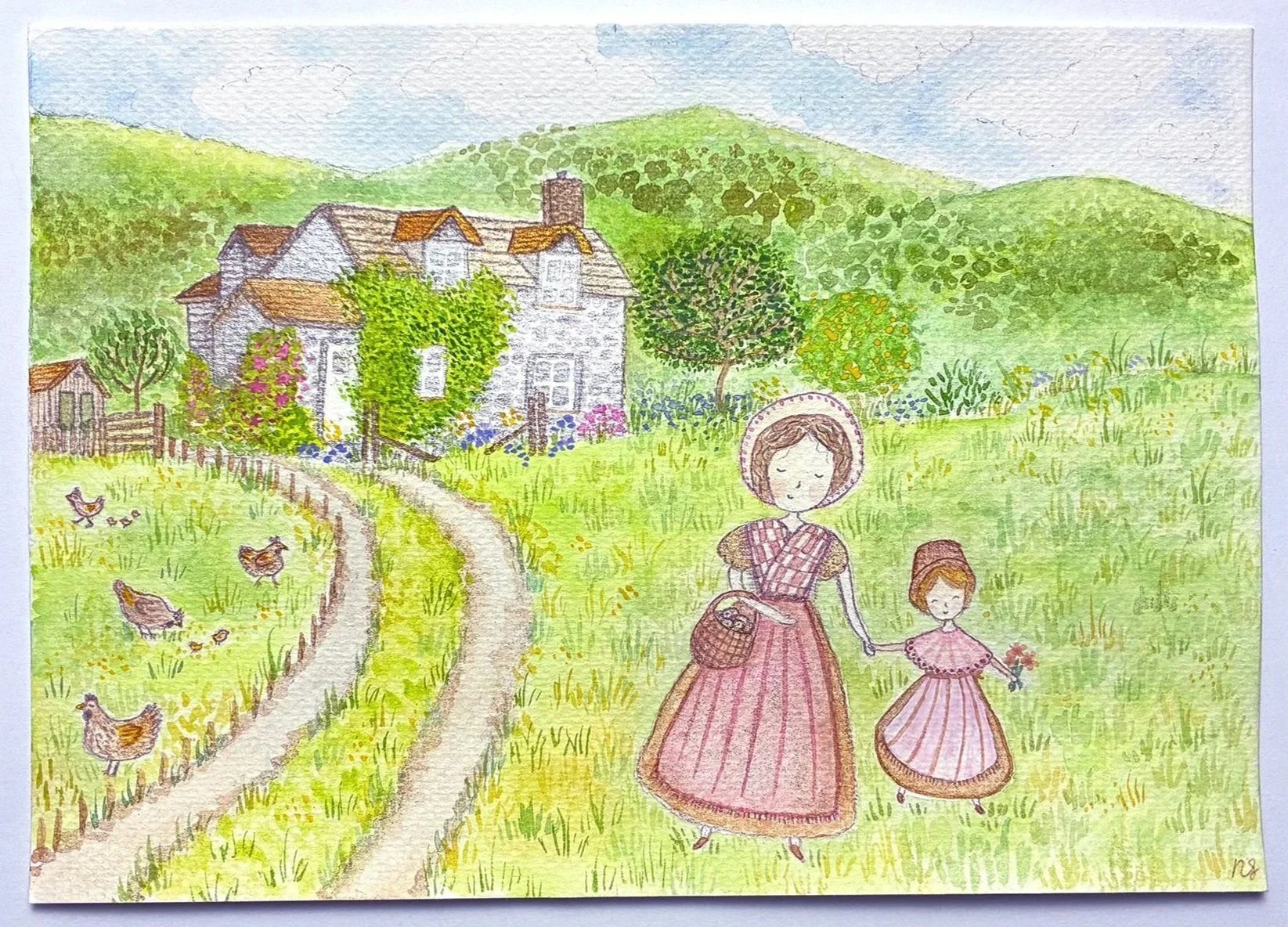 Bwthyn Adar (Bird Cottage). I created this piece after coming across a photo of a Welsh cottage that inspired me. The reference photo is of a real cottage in Llanidloes, Wales named Bird Cottage. I created the scene based on the photo, but created a story from my imagination. I researched traditional Welsh farmers and the outfits they used to wear, and the kinds of products they farmed. I decided to set my scene in the 1800s, and make my characters chicken farmers. I researched the traditional dress of Wales, and designed my own outfits for the characters.