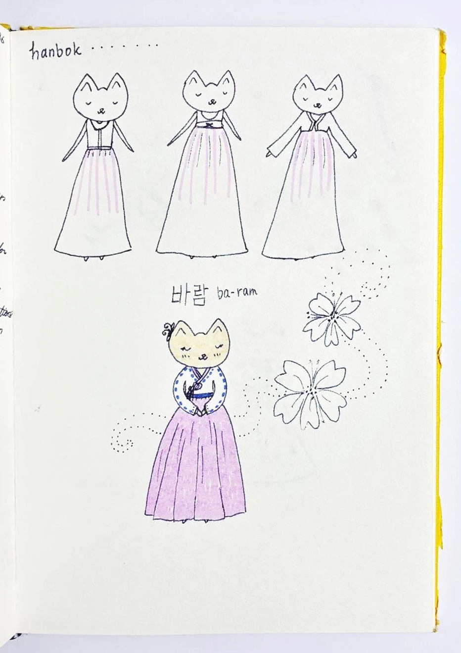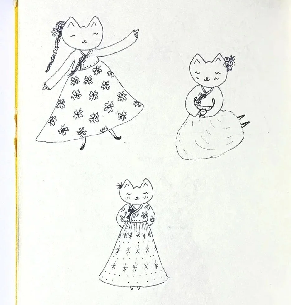 바 람 (Ba-ram). I love drawing the layers of an outfit and the process of a character putting them on. When I was little, I loved drawing outfits from around the world, and I still do. I created this drawing in my sketchbook just for fun.