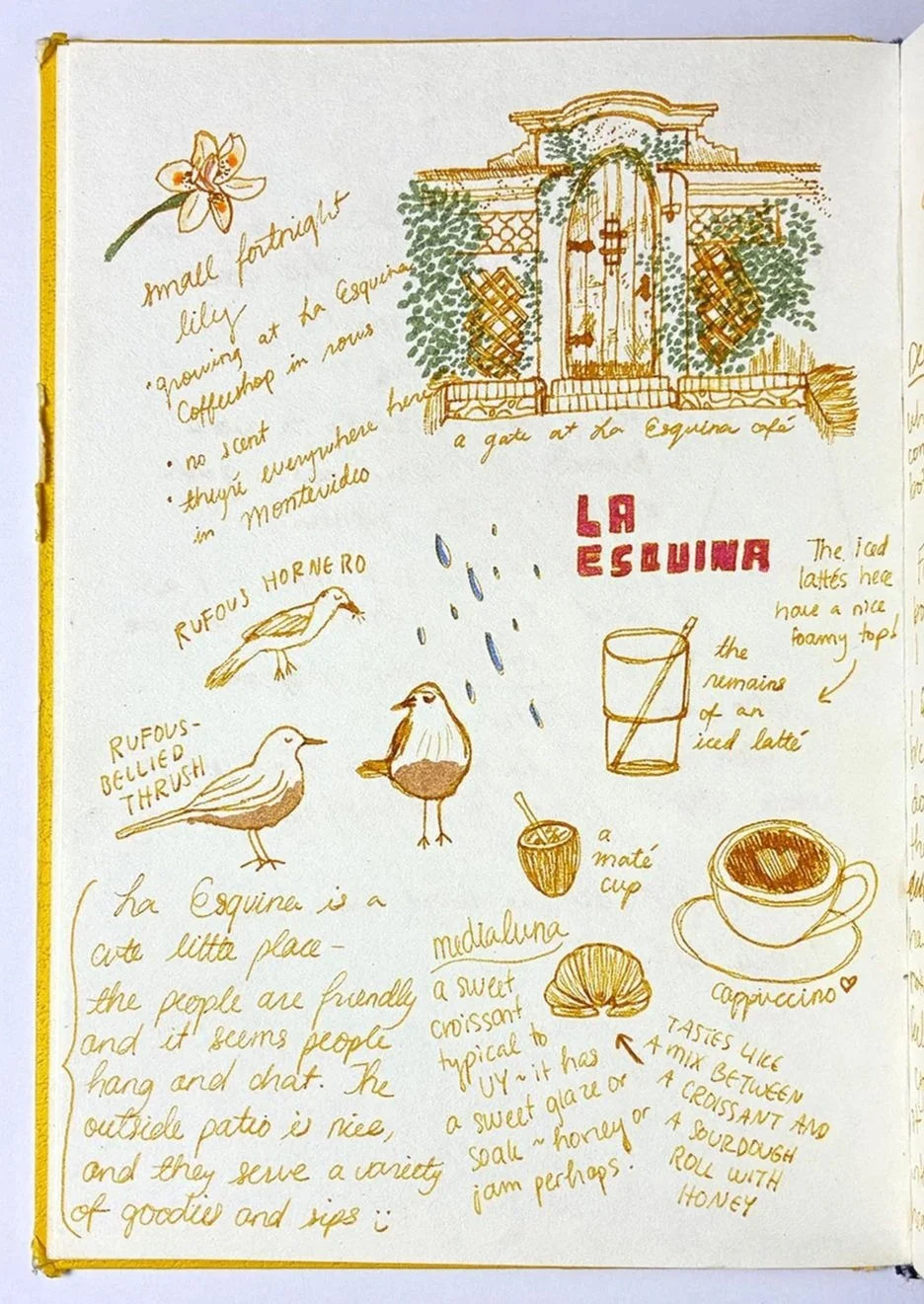 Observations at La Esquina Café. I recently moved with my family to Montevideo, Uruguay, and one of my favorite pastimes here has been exploring all the local cafés. My favorite is called La Esquina— my mom and I love to sit there for hours, often working on art together. This collection of sketches was inspired by some of my observations… I love this travel-journal style of illustrating. I’ve also included a photo of the gate I drew.