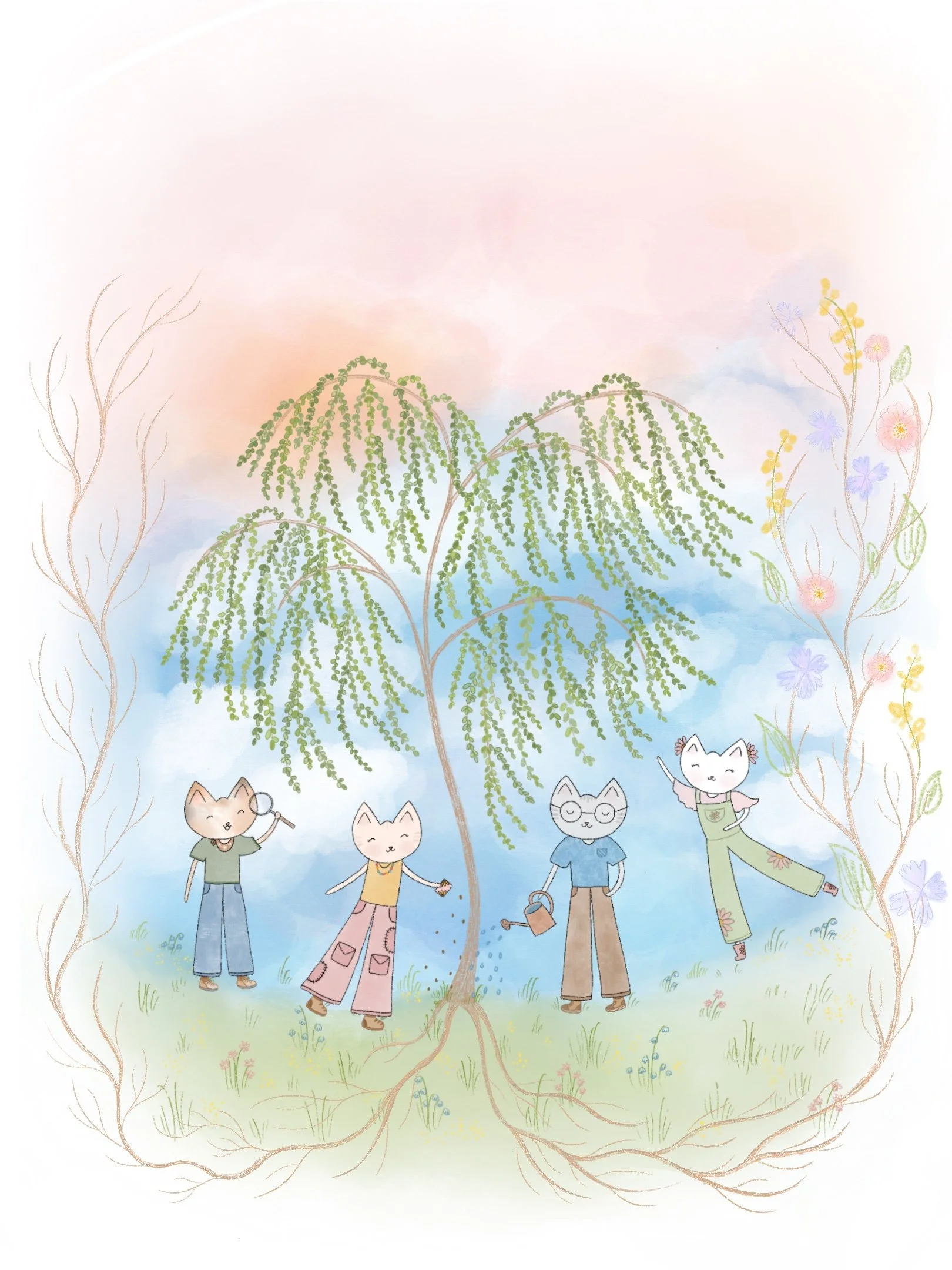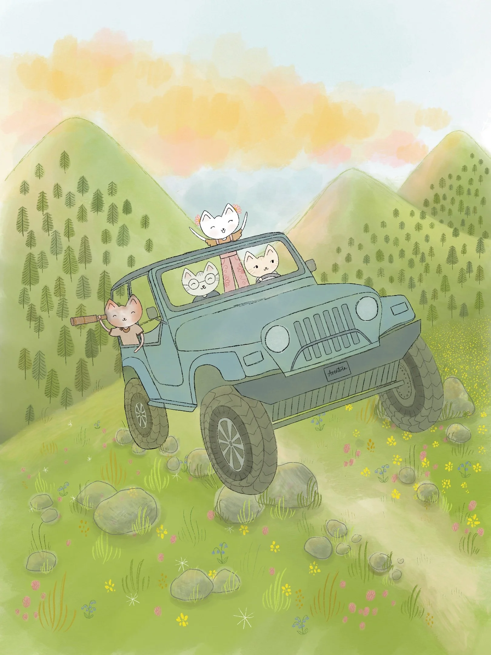 Aventura. This artwork is the back cover illustration for my book. I wanted to create an adventurous scene that would appeal to boys and girls alike, and decided to draw the four friends in a Jeep. In 2024, I purchased my first car: a green Jeep that I named Aventura (meaning adventure in Spanish). If you look closely, you’ll see the name inscribed on the license plate! I love including fun details in my art. I illustrated the car using a reference photo, customizing some parts to fit how I wanted the vehicle to look.