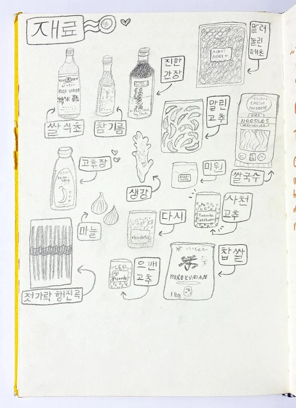 재료 (Ingredients). I was inspired to create this sketch after a family trip to a local Asian market. My mom and I were inspired to buy some of these special ingredients after watching K-dramas together— it sparked a new love for Korean culture for me! I’ve been having fun as I learn the Korean alphabet (and cook with new ingredients).