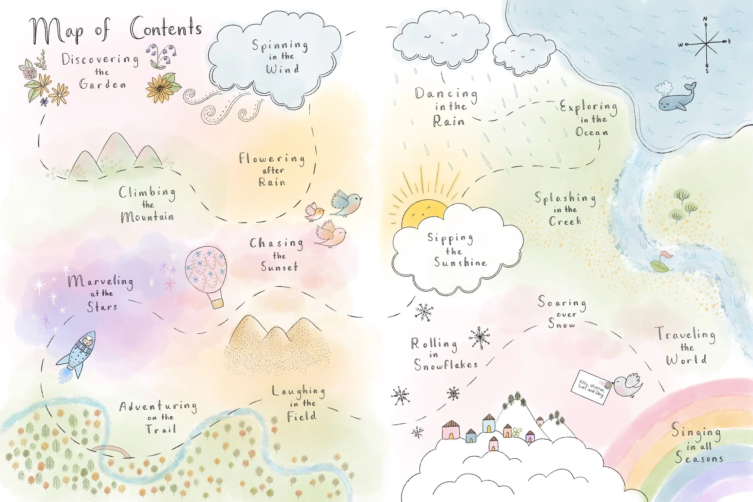 Map of Contents. I’ve loved creating maps since I was little, and I wanted to do something unique for a table of contents in my book. I designed this map to display the poems like chapters in a story, following a path through a fantasy land. All the details took many hours to complete! I thought about what images in each poem would work for a drawing, and arranged the elements into a cohesive imaginary land. The idea worked well, especially because the poems are inspired by places in the world or experiences in nature.