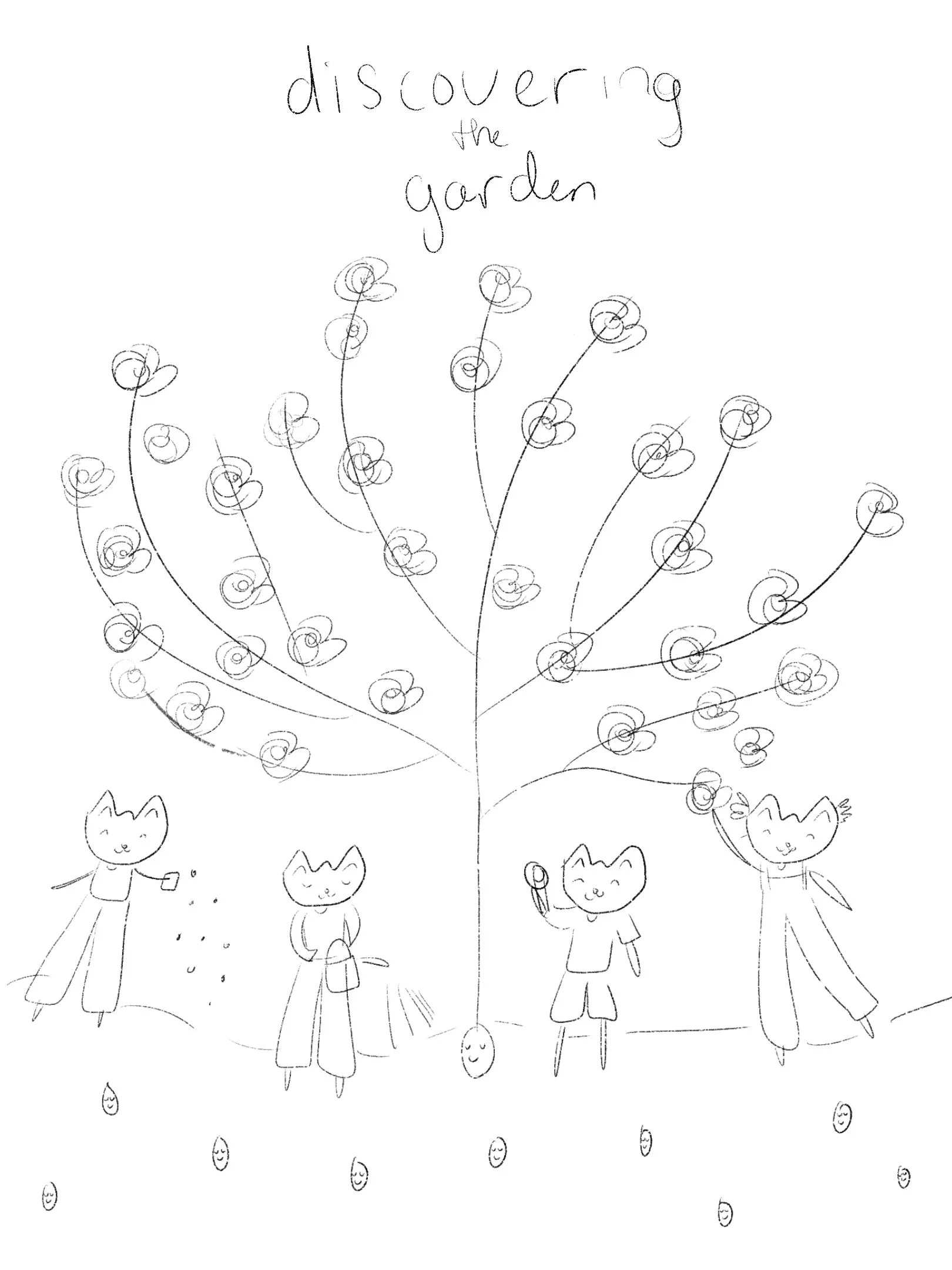 Cover Design. The cover probably took the most time out of any piece in my book. I wanted to explore the garden theme, but it took a long time to find an idea that felt right. These unfinished drafts show several stages along the way— rough concept sketches, an early rough cover sketch, and the progress of the final cover. These digital sketches were created throughout 2025, and I completed the cover in early fall of that year. I reworked the cover again several times to fit the parameters for publishing. I love how it turned out!