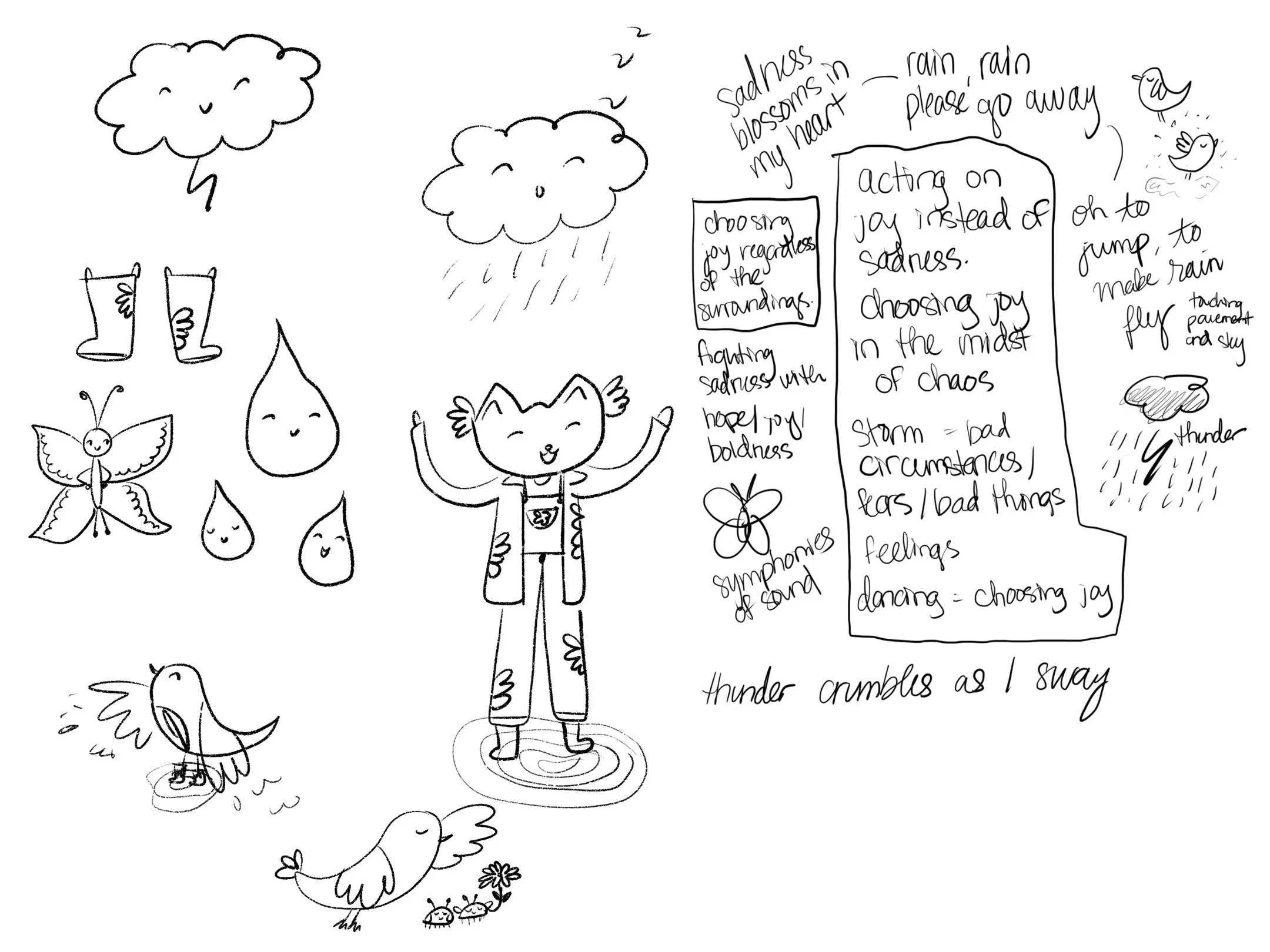 Dancing in the Rain. I’ve included some of the notes and concept sketches for this piece. While creating my book, I developed many of my drawings by writing out core words and ideas from the poems. I then created concept sketches, and played with different variations before landing on the final idea. Sometimes I got far along with an idea, and then totally reworked it! The final piece includes a weeping willow, one of my favorite trees. I’ve always loved these trees— they’re so graceful and seem poetic. I draw most details in my drawings by hand, with minimal copying and pasting— each leaf in this piece was drawn individually.
