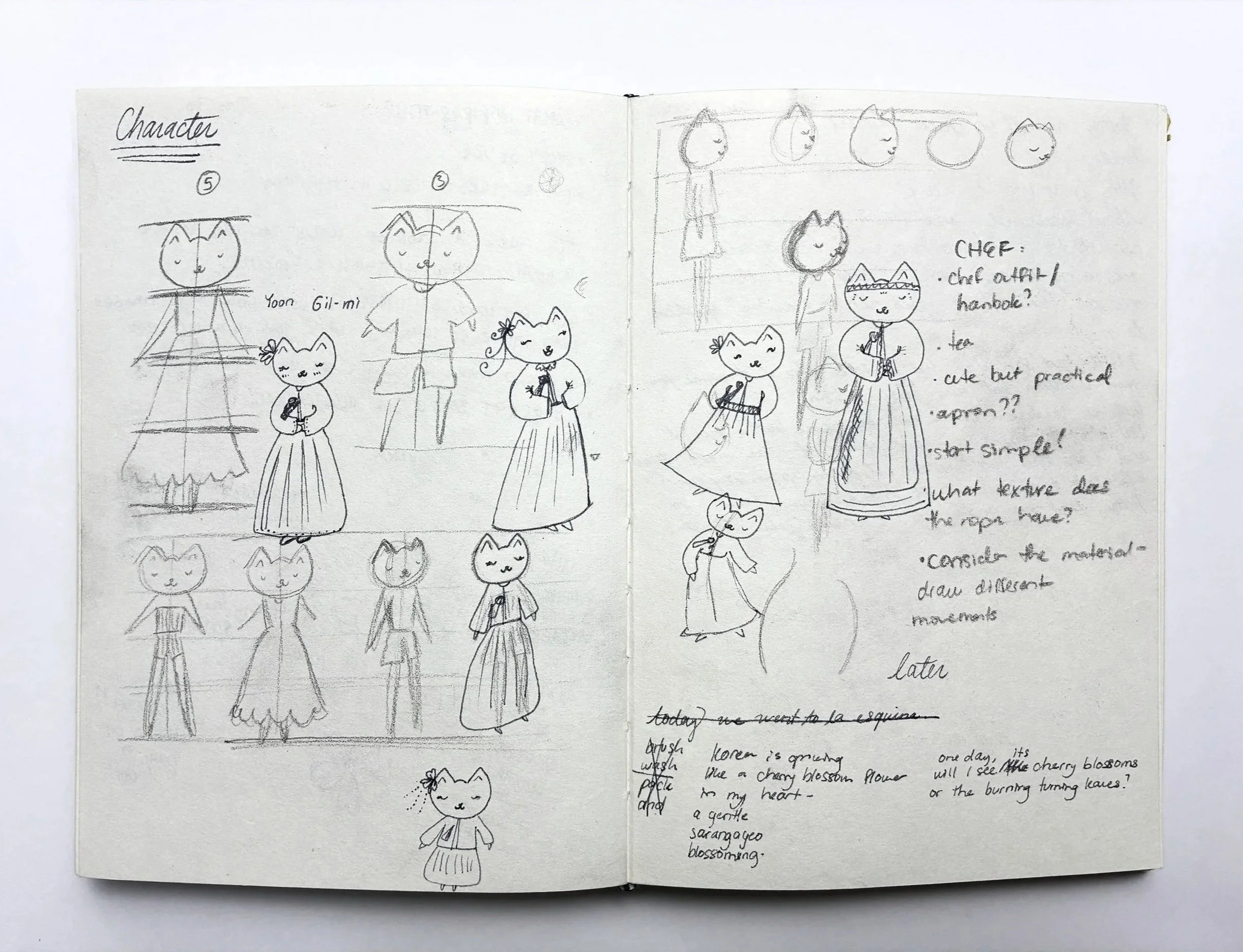 Korea Kitties. I sketched these characters just for fun, while riding in the car. Designing characters is one of my favorite parts of illustration— I like to imagine different outfits and looks.