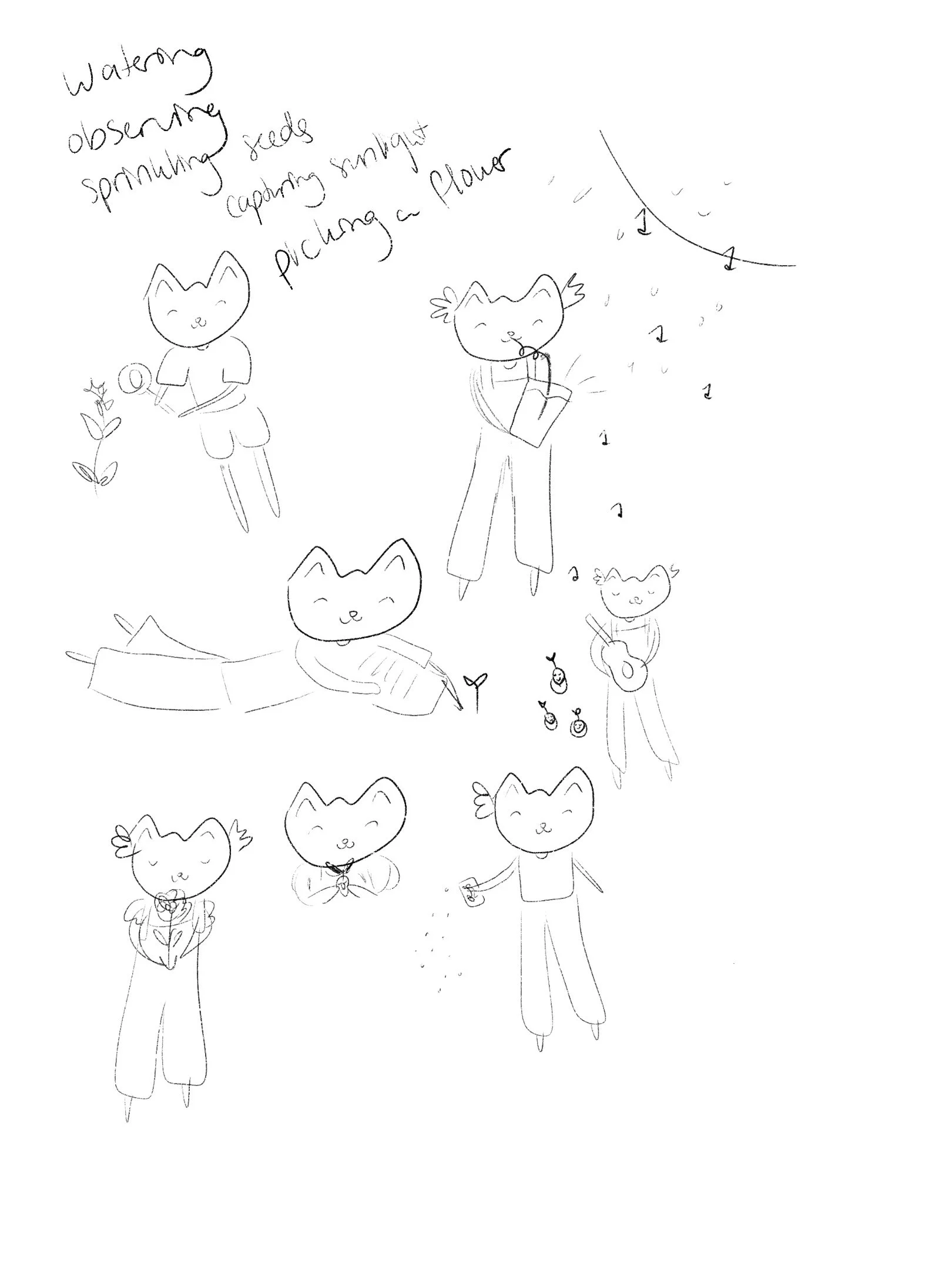 Character Sketches. I recently took an online course by an artist named Flor Kaneshiro, and created these sketches for an exercise exploring character design. These sketches explored some fun character ideas, and different positions and sizing.