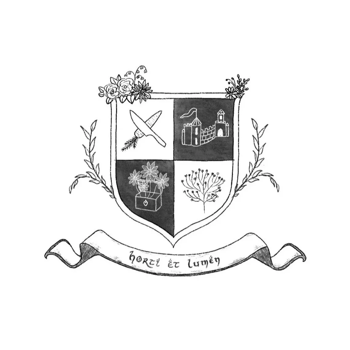 Horti et Lumen. I drew this piece for a personal project. I wanted to create some stickers for family friends for a Christmas gift, and decided to design a crest reflecting our family names. I thought about what our respective family names meant, and drew inspiration from what our families love to do together, as well as who we are as people. I created my own Latin motto based on this. One of my favorite memories together is when we had a “Hobbit Thanksgiving”— we cooked an abundance of food and watched the Lord of the Rings series together. Inspired by this memory, I drew the motto in a Hobbit-ish font. It was a special project that I enjoyed putting together.